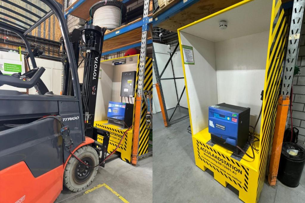 Ons Accu-laadstation is ontworpen om risico’s tot een minimum te beperken. De gehele laadruimte is omgeven met onbrandbare wanden, vervaardigd volgens brandklasse NEN EN 13501-A1, waardoor een eventuele brand niet snel om zich heen kan grijpen. Daarnaast wordt de acculader geplaatst op een verhoogd platform van 50 cm. Dit zorgt niet alleen voor extra bescherming tegen externe invloeden, maar ook voor verbeterde luchtcirculatie en koeling tijdens het laden.